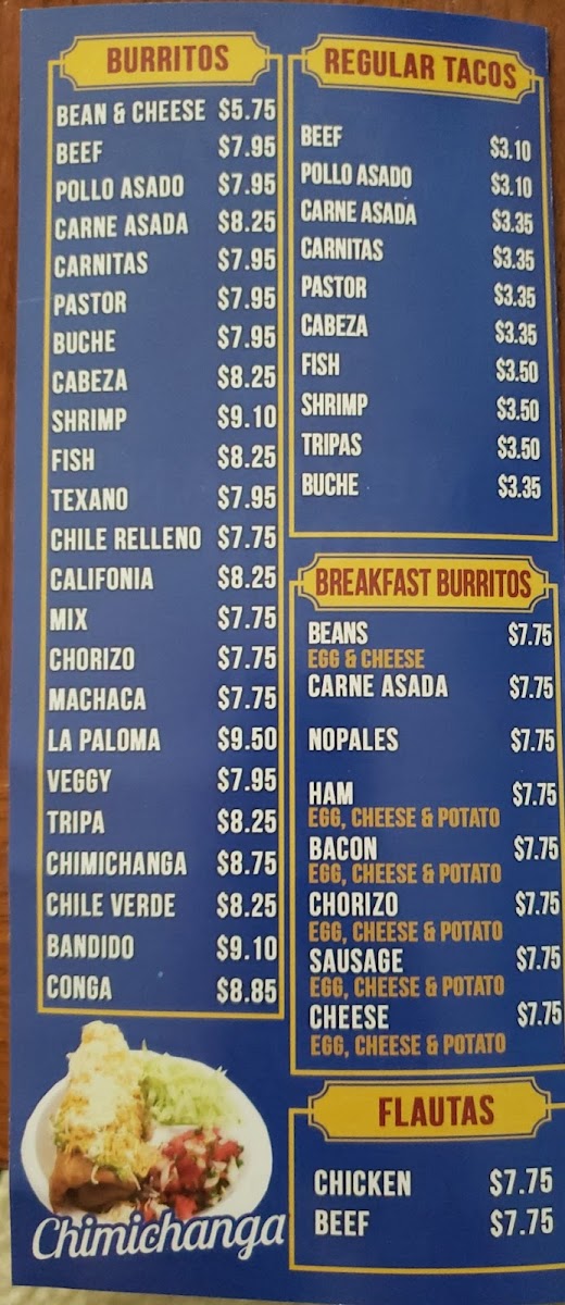 - Breakfast Items: Burritos such as chorizo, machaca, ham and egg, and omelettes, catering to morning or brunch meals.